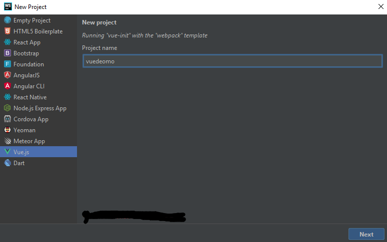 可以使用CMD命令行进行项目的初始化,然后再用IDE导入,这里选择了IDE直接新建项目作为记录。打开webstorm,new project,选择 VUE.js,键入项目路径和名称,我这里是 vuedemo,如图: