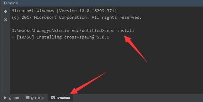 这时候直接点击 run 是会报错的,需要在CMD进行 cnpm install 安装。。