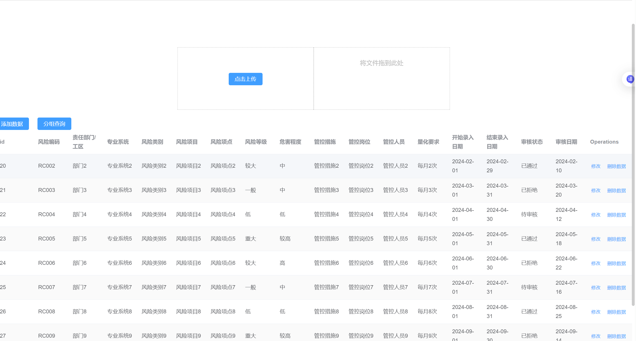 今天下午到晚上,大概5个小时,完成了完整的增删改查和分组查询,完成了router的配置,为后续前端的对接做了一定的准备。还完成了文件导入的前端,处理逻辑尚未完成。
