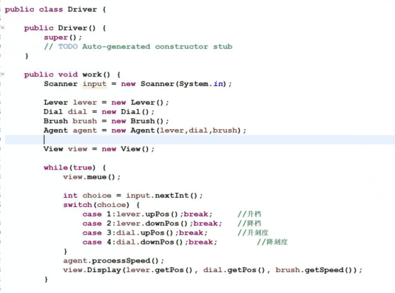 耦合度,这一个词同样应用在课堂的练习中雨刷示例中利用Driver类来实现一个中介的作用以降低耦合度.