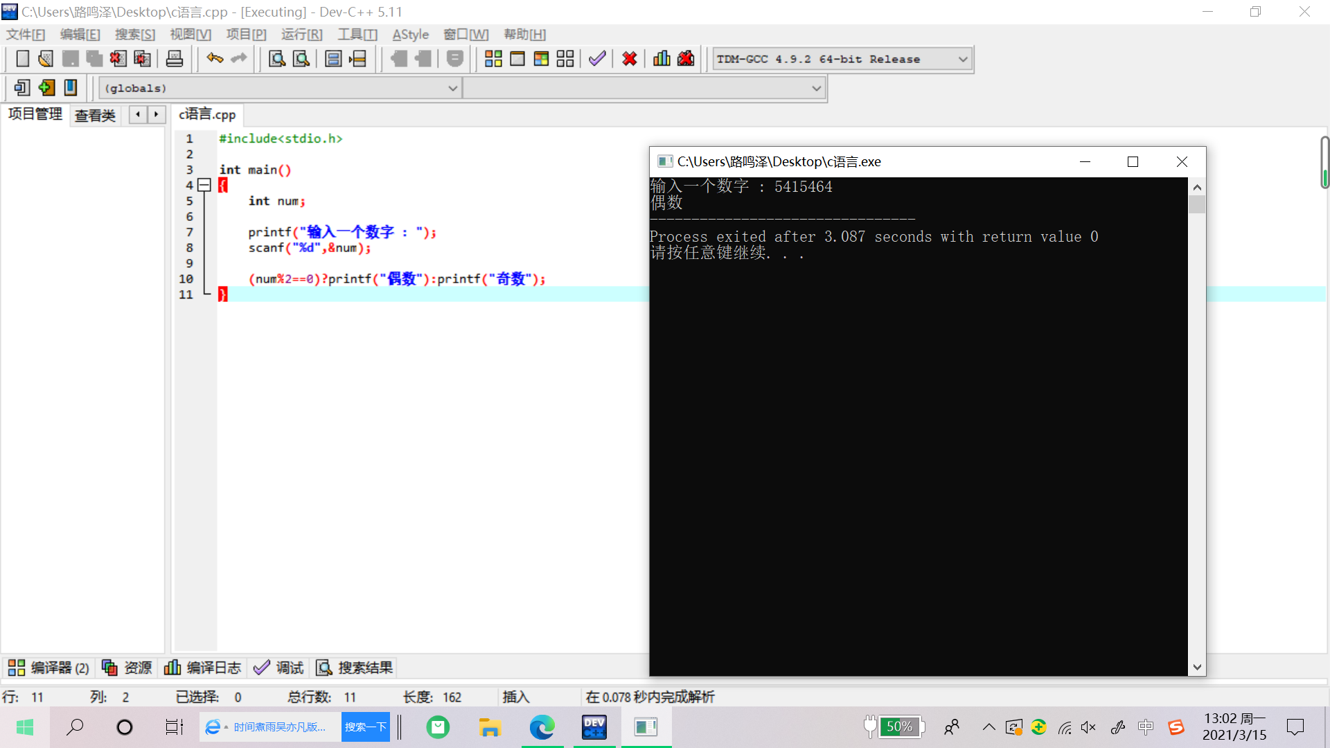 #include<stdio.h> int main() { int num; printf("输入一个数字 : "); scanf("%d",&num); (num%2==0)?printf("偶数"):printf("奇数"); }