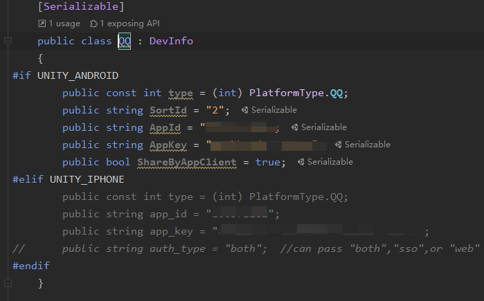 第六步:在ShareSDK脚本中找到DevInfo定义的地方找到QQ类:修改其中的ID和KEY。