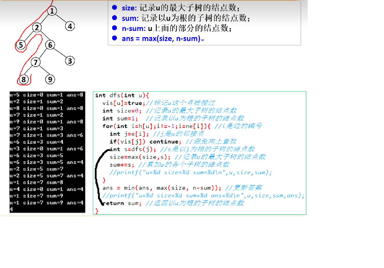 需要算出u的最大子树的节点树和u上面的部分的节点数,然后取两者的最大值。