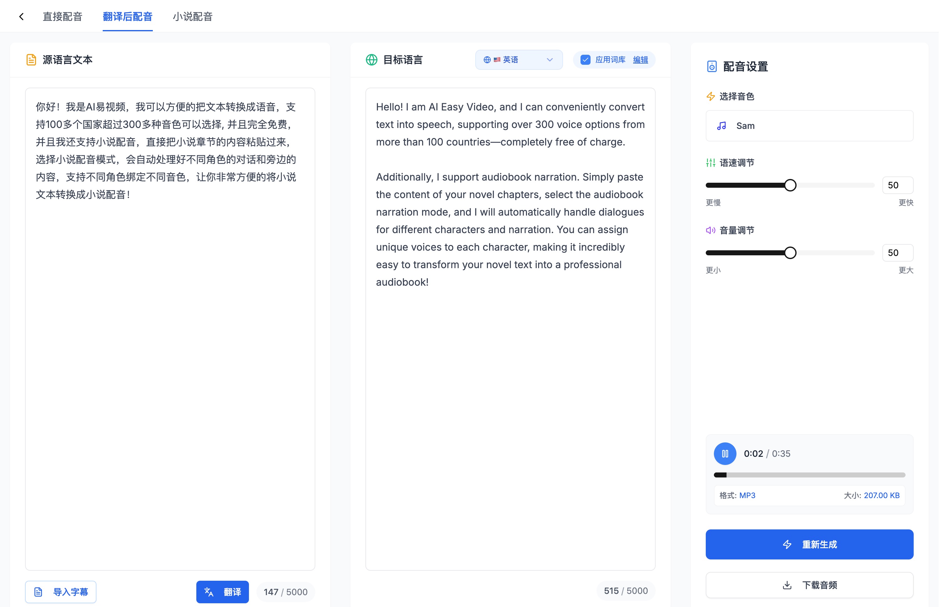 AI易视频的小说转语音功能尤为出色,它能智能格式化小说内容,识别人物对话,并为不同角色设置不同音色,使作品更具表现力。对于小说创作者和有声书爱好者来说,这是一个理想的选择。