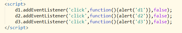 此时若修改d1的useCapture为true,则d1绑定的click在事件捕获阶段就会执行,即依次弹出‘d1’,‘d3’,‘d2’。