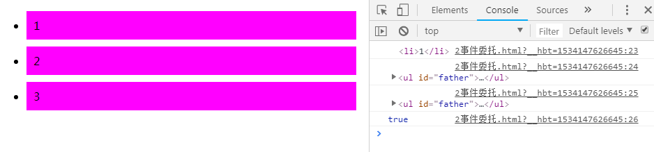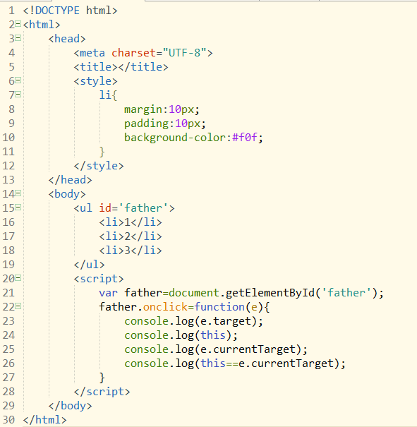 3)事件委托就是利用了事件冒泡的原理。把要执行相同事件的子元素的事件委托给父元素,只用在父元素绑定一个事件就可以,在冒泡阶段执行。此时可以用e.target获取目标元素,即点击了哪个元素。如下: