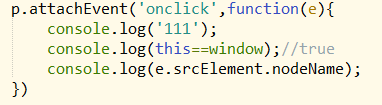 与addEventListener不同的是:此时this指向window,而在addEventListener中,是指元素p本身。