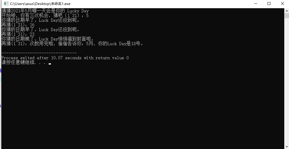 #include <stdio.h> #include <stdlib.h> #include <time.h> #define N 3 int main() { int x, n, i; printf("猜猜2021年5月哪一天会是你的 Lucky Day\n开始喽,你有三次机会,猜吧(1~31):"); srand(time(0)); x =1+ rand() % 31; for (i=1;i<=3;){ scanf("%d",&n); if (n==x){ printf("猜对啦!\n"); break; } else if (n<x){ printf("你猜的日期早了,Luck Day还没到呢。\n"); } else { printf("你猜的日期晚了,Luck Day悄悄溜到前面啦。\n"); } i++; printf("再猜(1~31):"); if (i>3) printf("次数用完啦,偷偷告诉你:5月,你的Luck Day是%d号。\n",x); } return 0; }