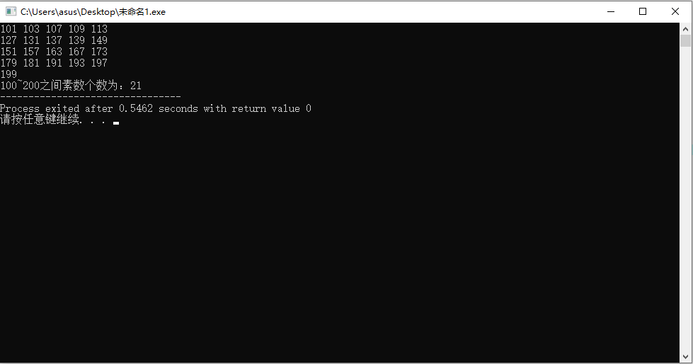 #include<stdio.h> #include<math.h> int main(){ int k,num=0; for(k=101;k<=200;k++) { int i; for(i=2;i<=sqrt(k);i++) if(k%i==0) break; if(i>sqrt(k)) { printf("%d ",k); num++; if(num%5==0) printf("\n"); } } printf("\n100~200之间素数个数为:%d",num); return 0; }