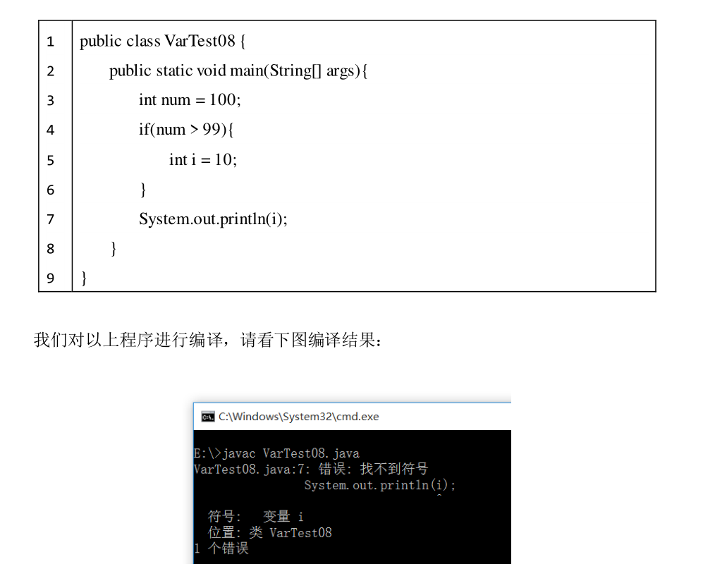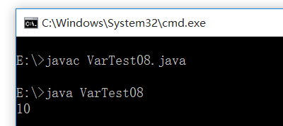 1 public class VarTest08 { 2 public static void main(String[] args){ 3 int num = 100; 4 int i = 0; 5 if(num > 99){ 6 i = 10; 7 } 8 System.out.println(i); 9 } 10 }