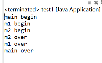 public class test1 { public static void main(String[] args) { // TODO Auto-generated method stub System.out.println("main begin"); m1(); System.out.println("main over"); } public static void m1() { System.out.println("m1 begin"); m2(); System.out.println("m1 over"); } public static void m2() { System.out.println("m2 begin"); System.out.println("m2 over"); } }