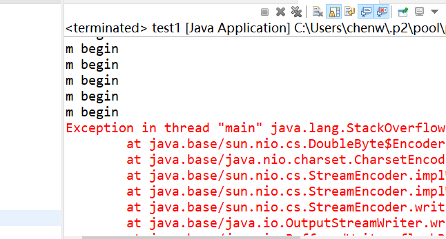 public class test1 { public static void main(String[] args) { // TODO Auto-generated method stub m(); } public static void m() { System.out.println("m begin"); m(); System.out.println("m over"); } }