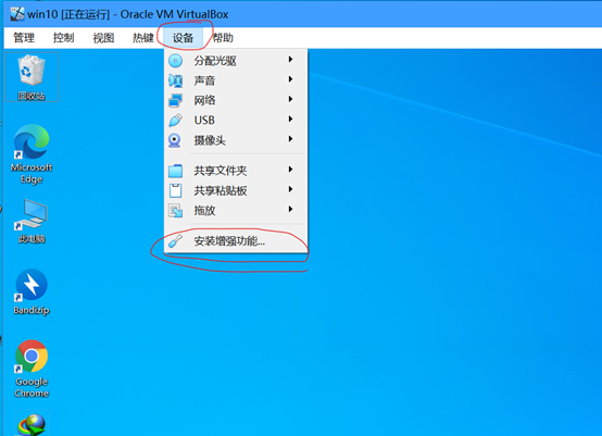 1:功能栏(没有的话右面的ctrl键+c)-->设备-->安装增强功能