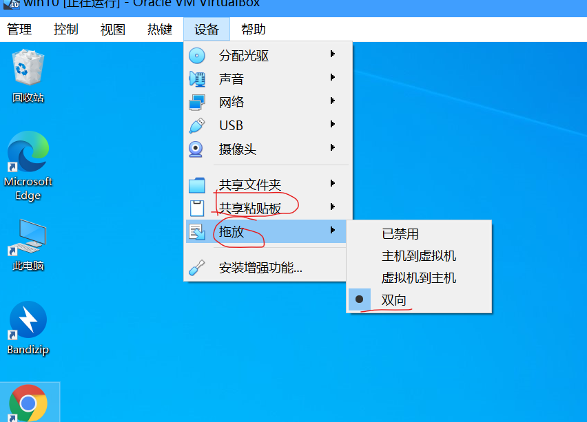 共享粘贴板和拖放都选择双向,就可以实现主机和虚拟机之间共享复制粘贴和文件拖放了