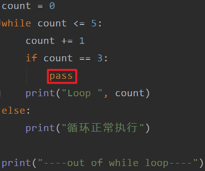 现在改成pass,当while部分执行完后,会继续执行else里的代码。