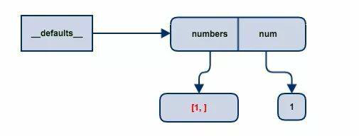 初始化完成时,属性__defaults__中的第一个默认参数numbers指向一个空列表。