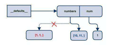 执行完 func(numbers=[10, 11])后,在函数对象内部,numbers变量依然指向[1, 1,],并不会因为调用后就指向[10, 11]。