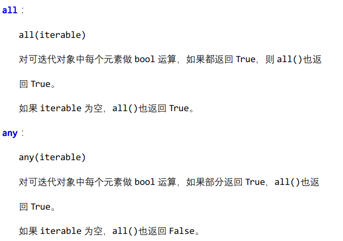 print(all([1, 2, 3])) print(all([1, '', 0])) print(all([[], 1, 2])) print(all([]))