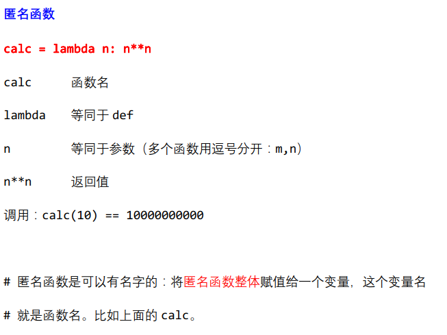 t = lambda : True # 分号前无任何参数 print(t()) # 等价于 def func(): return True