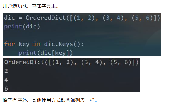 dic2 = OrderedDict([(1, "查看数据"), (2, "编辑数据"), (3, "删除数据")]) print(dic2) for key in dic2.keys(): print(key, dic2[key])