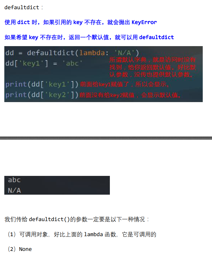 # 这里提个错误,传递None给defaultdict会报错。所以目前已知:只能传递可调用对象,且该对象要返回数据。