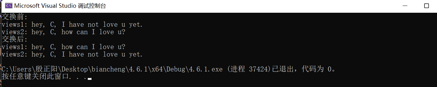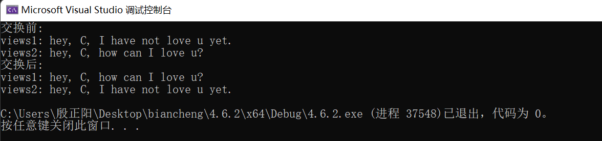 char views[2][N] = { "hey, C, I have not love u yet.",