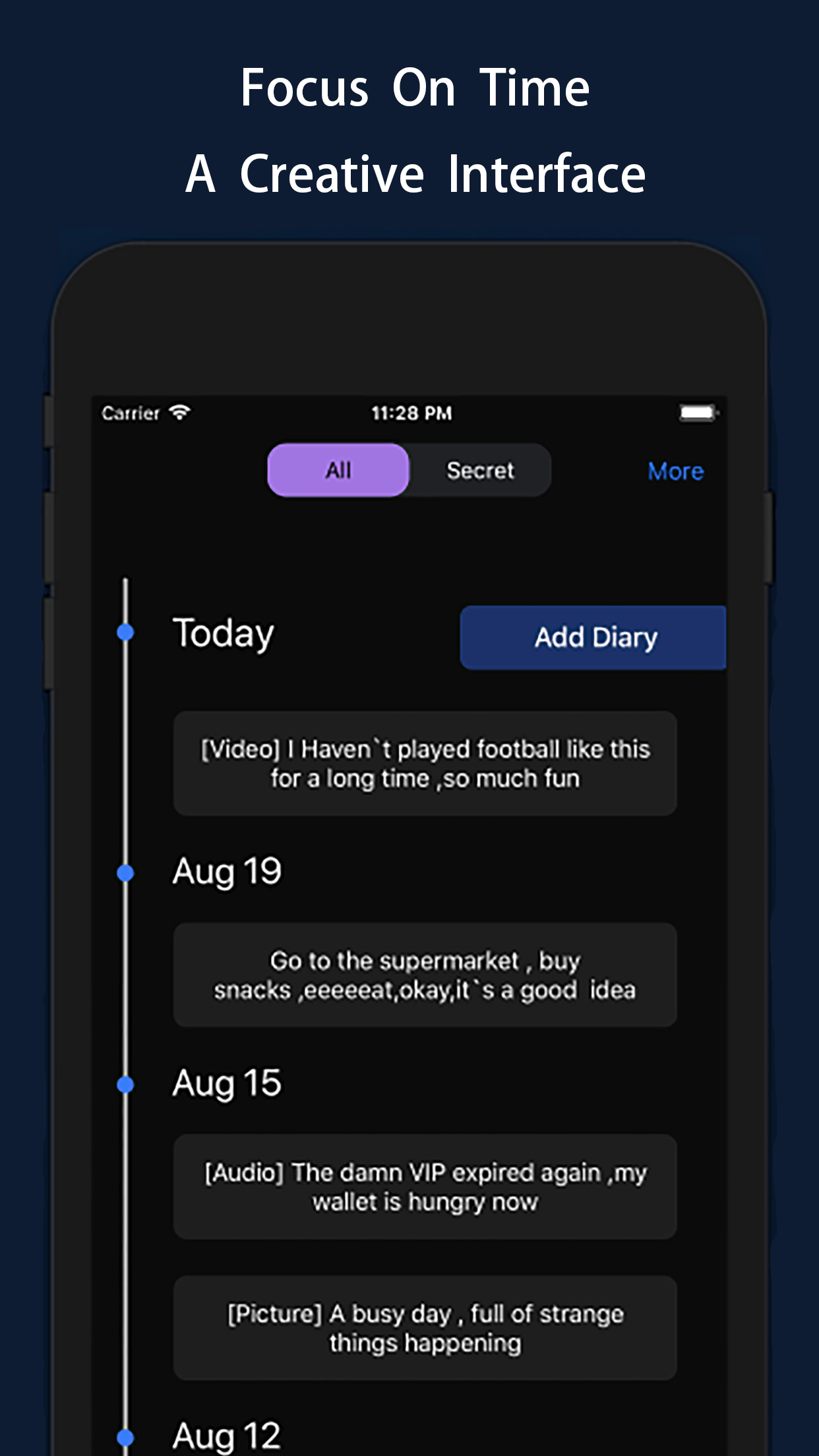 The above picture shows the main interface of "Time Diary". As you can see, there is a clear timeline on the left. When you swipe up and down, you can clearly browse the changes of the diary release time.