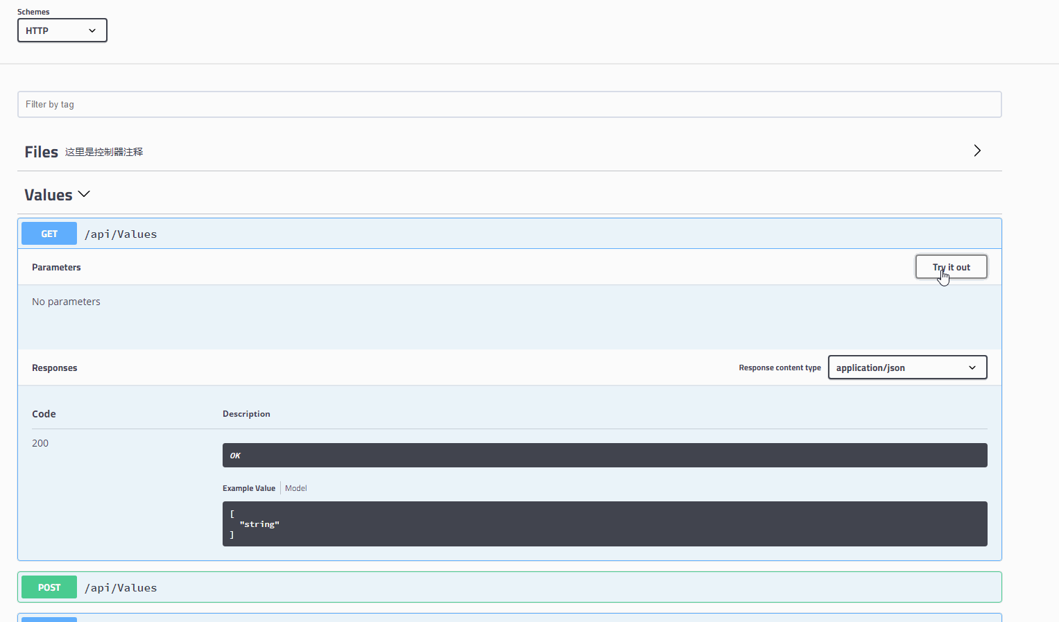 public class GlobalHttpHeaderFilter : IOperationFilter { public void Apply(Operation operation, SchemaRegistry schemaRegistry, ApiDescription apiDescription) { if (operation.parameters == null) operation.parameters = new List<Parameter>(); //var filterPipeline = apiDescription.ActionDescriptor.GetFilterPipeline(); //判断是否添加权限过滤器 //var isAuthorized = filterPipeline.Select(filterInfo => filterInfo.Instance).Any(filter => filter is IAuthorizationFilter); //判断是否允许匿名方法 var isNeedLogin = apiDescription.ActionDescriptor.GetCustomAttributes<ApiAuthAttribute>().Any();//是否有验证用户标记 if (isNeedLogin)//如果有验证标记 多输出1个文本框(swagger form提交是会将这两个值放到header中) { operation.parameters.Add(new Parameter {name="auth",@in="header",description="令牌(登陆后可以获取)",required=false,type="string" }); } } }