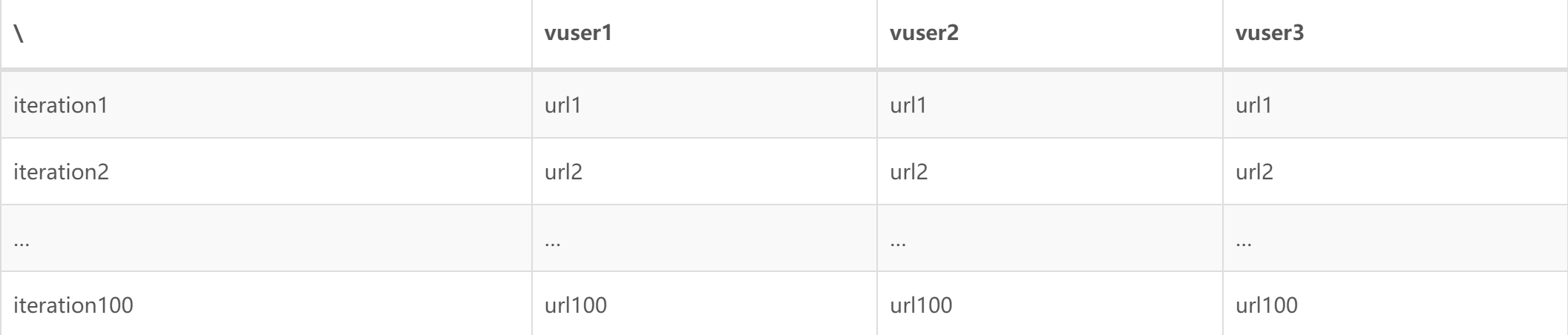 例如,模拟3用户并发请求网页,总共有100个URL地址,每个虚拟用户都会依次循环加载这100个URL地址;加载示例如下表所示。