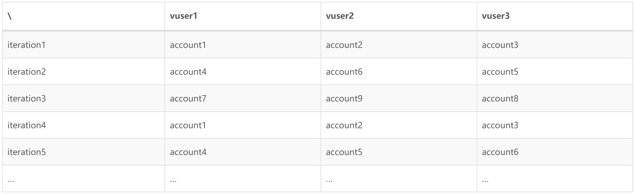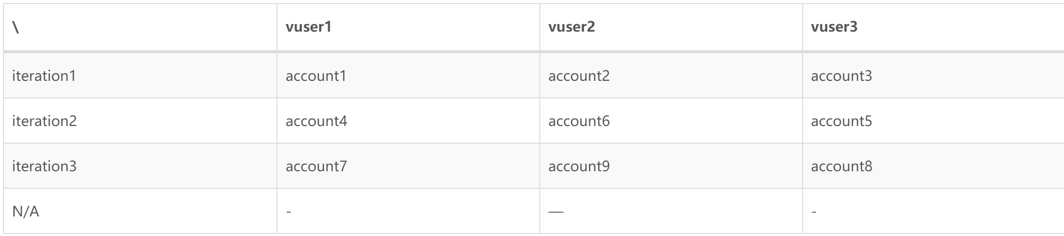 所有并发虚拟用户共享同一份测试数据,各虚拟用户在数据列表中循环取值。