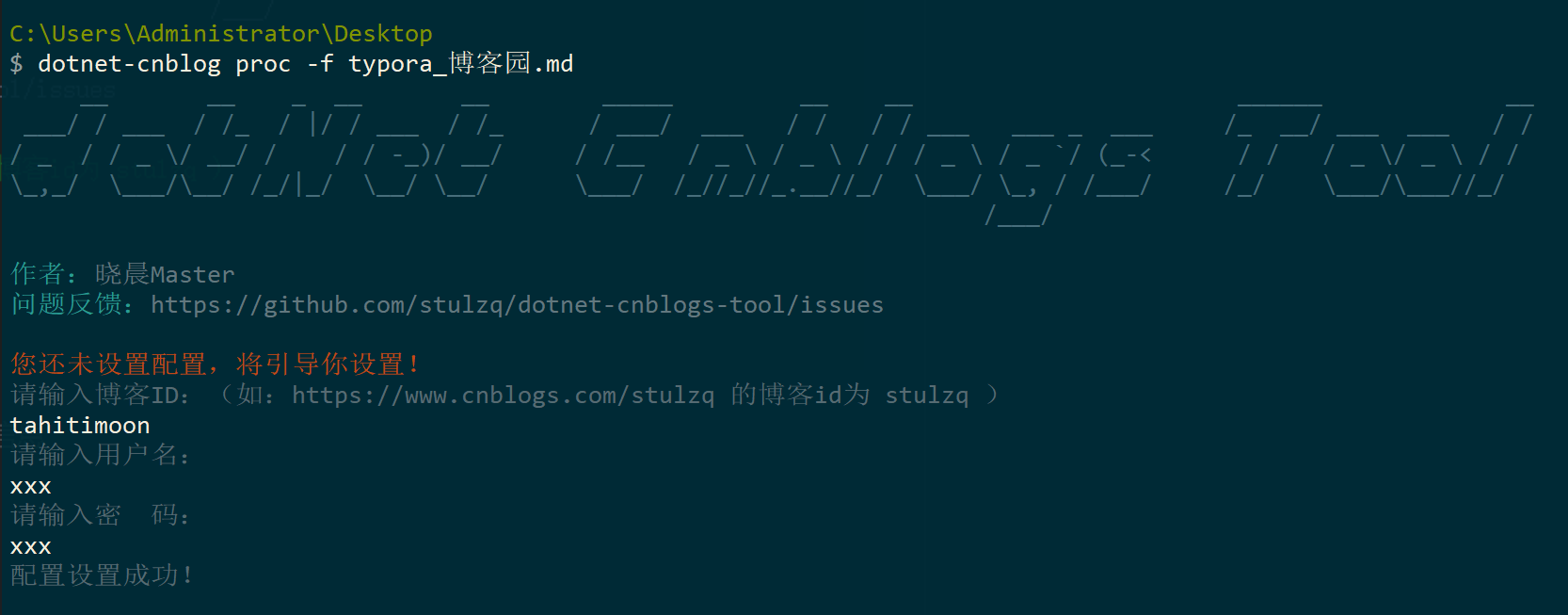 第一次运行时需要配置博客ID,账号密码等,按照提示输入即可,用户名为登录账号。