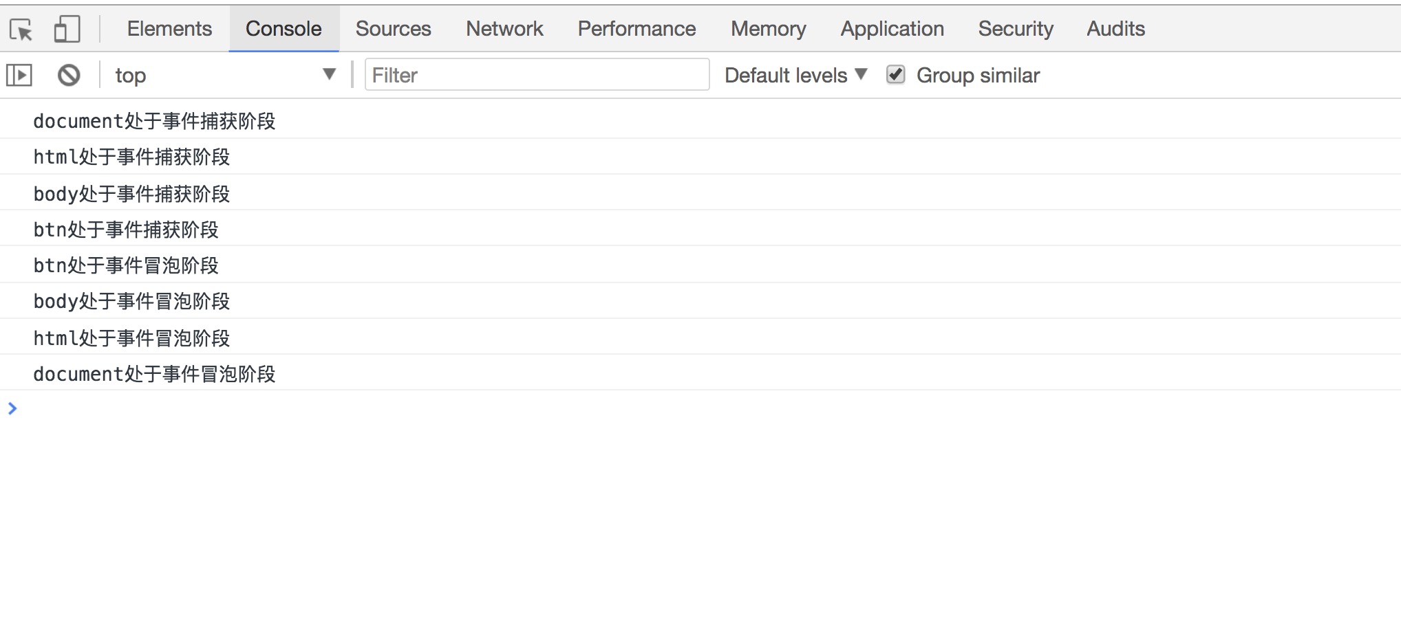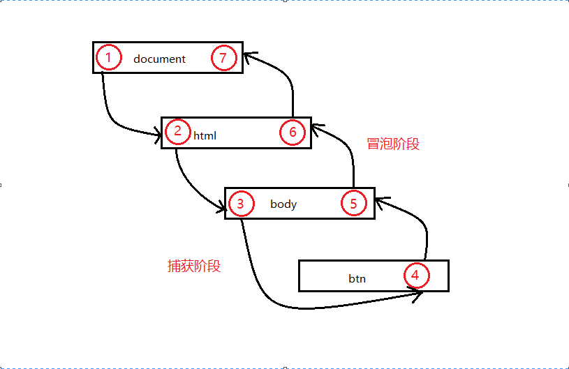 首先在事件捕获过程中,document对象首先接收到click事件,然后事件沿着DOM树依次向下,一直传播到事件的实际目标,就是id为btn的a标签。