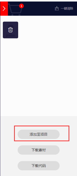 2、搜索所需的icon --> “添加入库”--> “添加至项目”