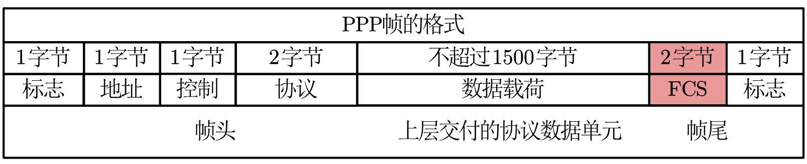 在封装好的帧中利用若干个字节表示帧校验序列FCS字段。FCS:Frame Check Sequence(帧校验序列)。FCS字段由一些差错校验算法计算得出,常用的校验算法为:循环冗余校验CRC(Cyclic Redundancy Check)。