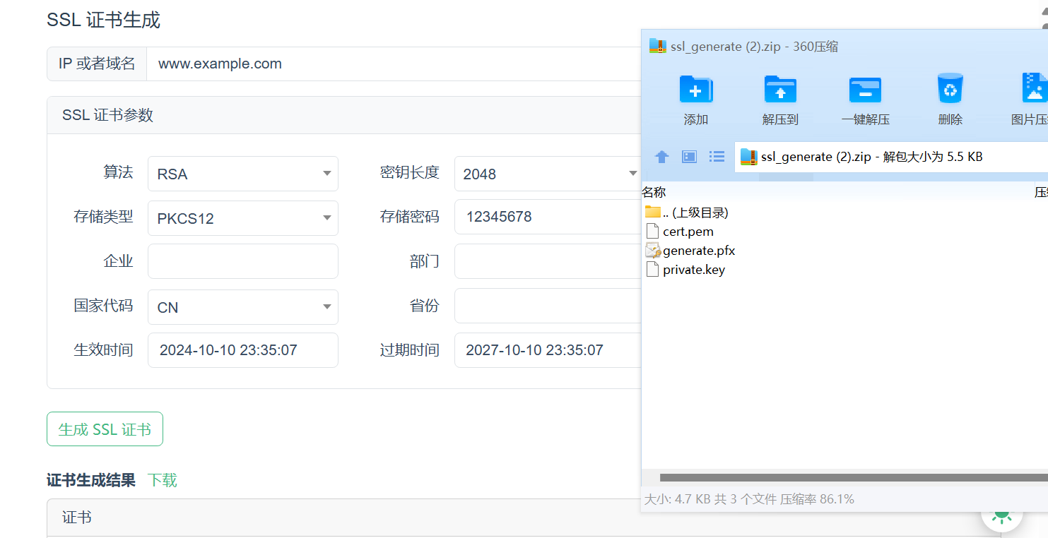 由于属于实验性质,所以在其他的网站来做 SSL 证书的生成如:https://www.toolhelper.cn/SSL/SSLGenerate