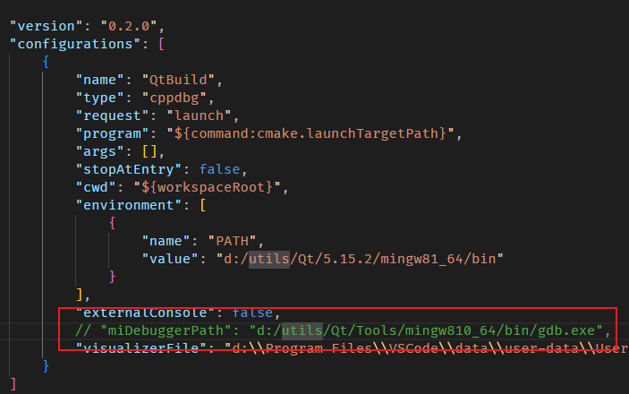 需要注意的是:在自动生成的launch.json中需要确保debug工具与项目选用的编译器在同一路径下,我这里用的不是Qt/Tools下的编译器,因此注释掉才可以正常运行。
