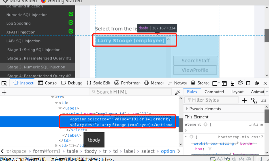 绕过认证执行SQL注入,使登录Larry账户,但是能查看Boss的信息。和之前的想法一样,我们只需将employee_id参数修改为: 101 or 1=1 order by salary desc