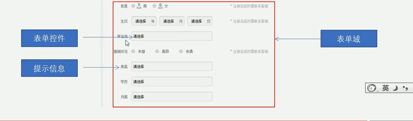 在html中完整的表单通常需要3个部分组成,表单域、表单控件(也称作为表单元素)和提示信息