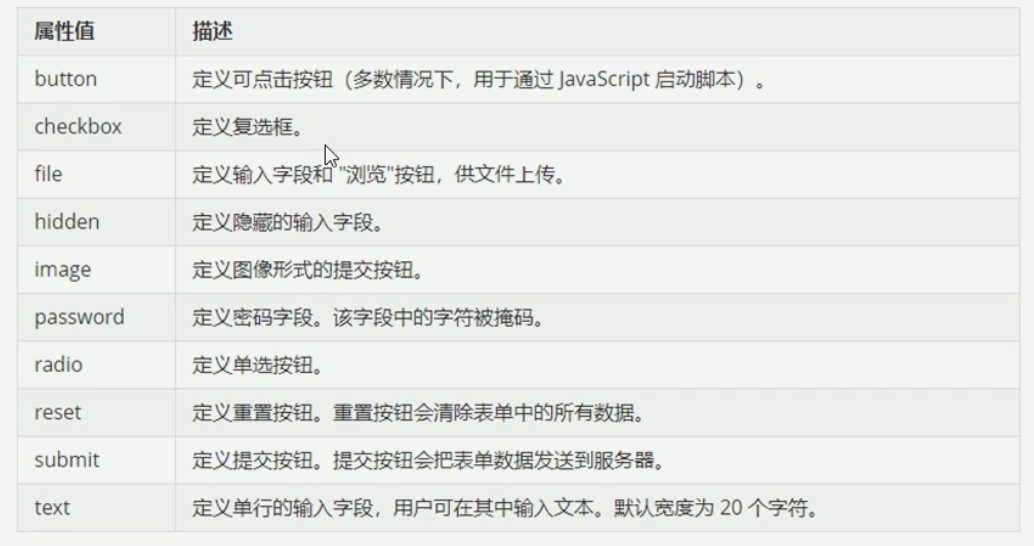 标签中,包含一个type属性,根据不同的type属性值,输入字段有很多种形式(可以是文本字段、复选框、掩码后的文本空间、单选按钮、按钮等)。