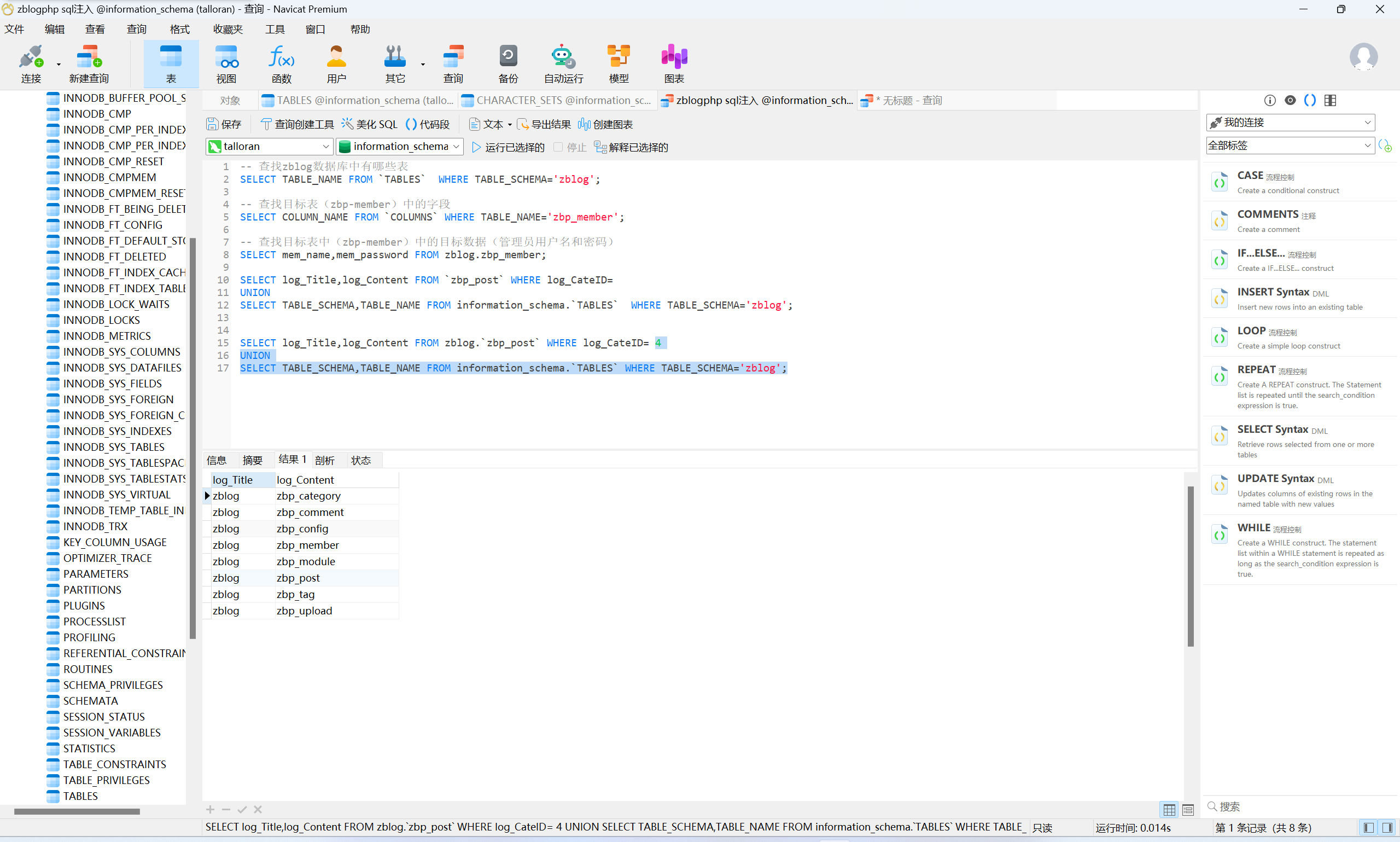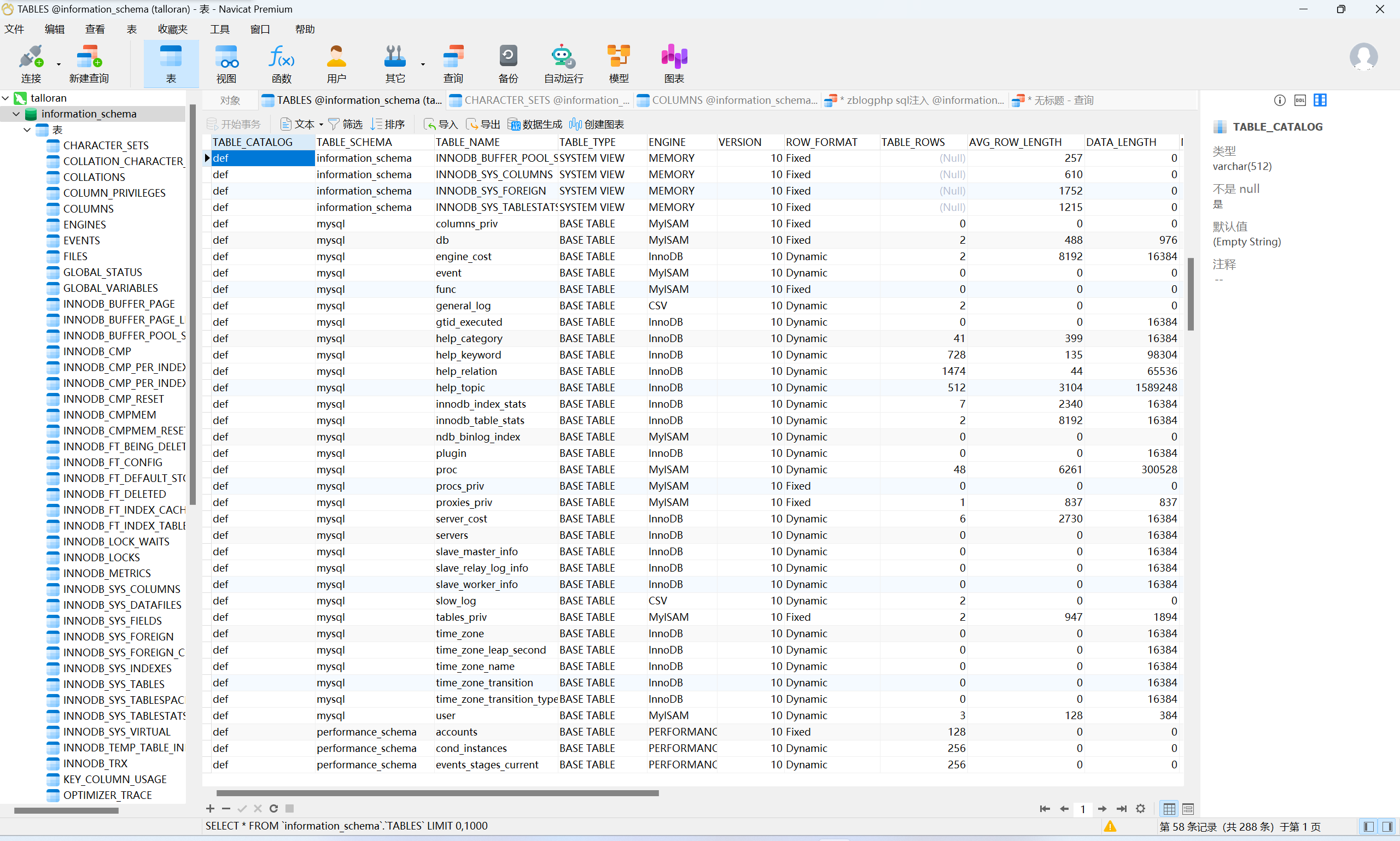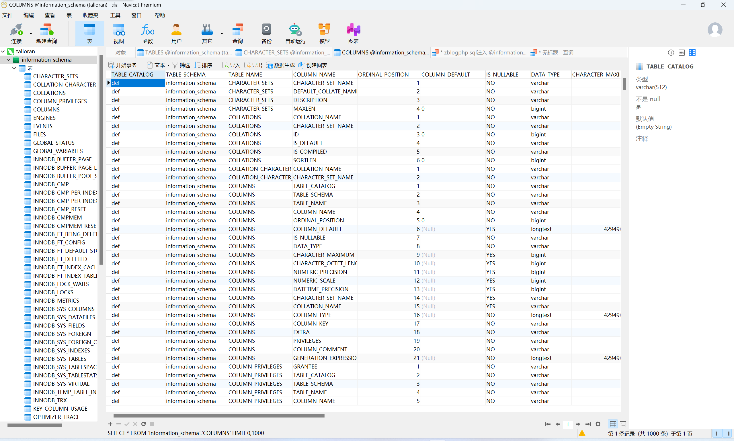 找到数据库中的table表和colmuns表,里面是本机所有的数据库。