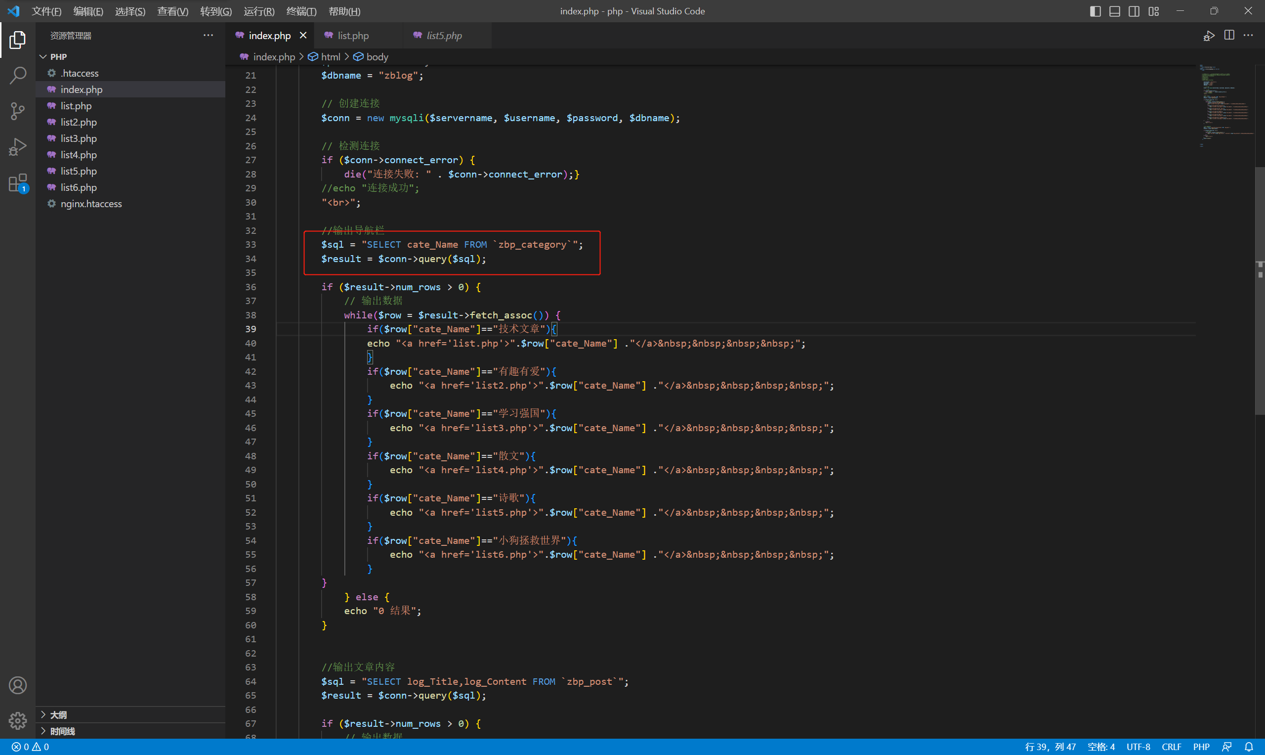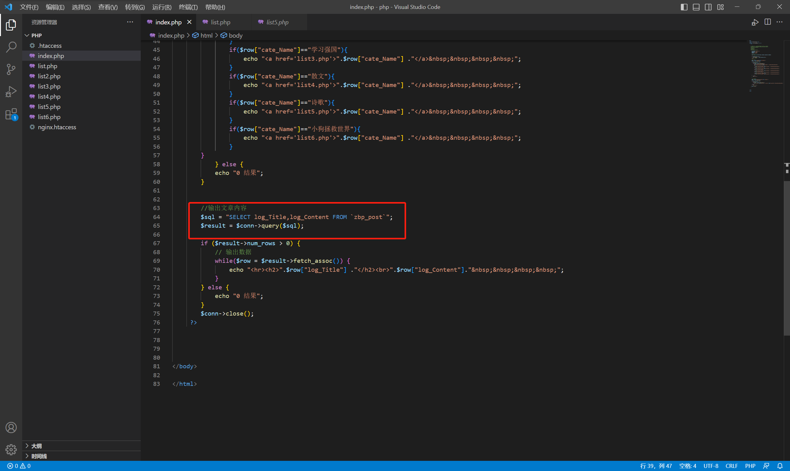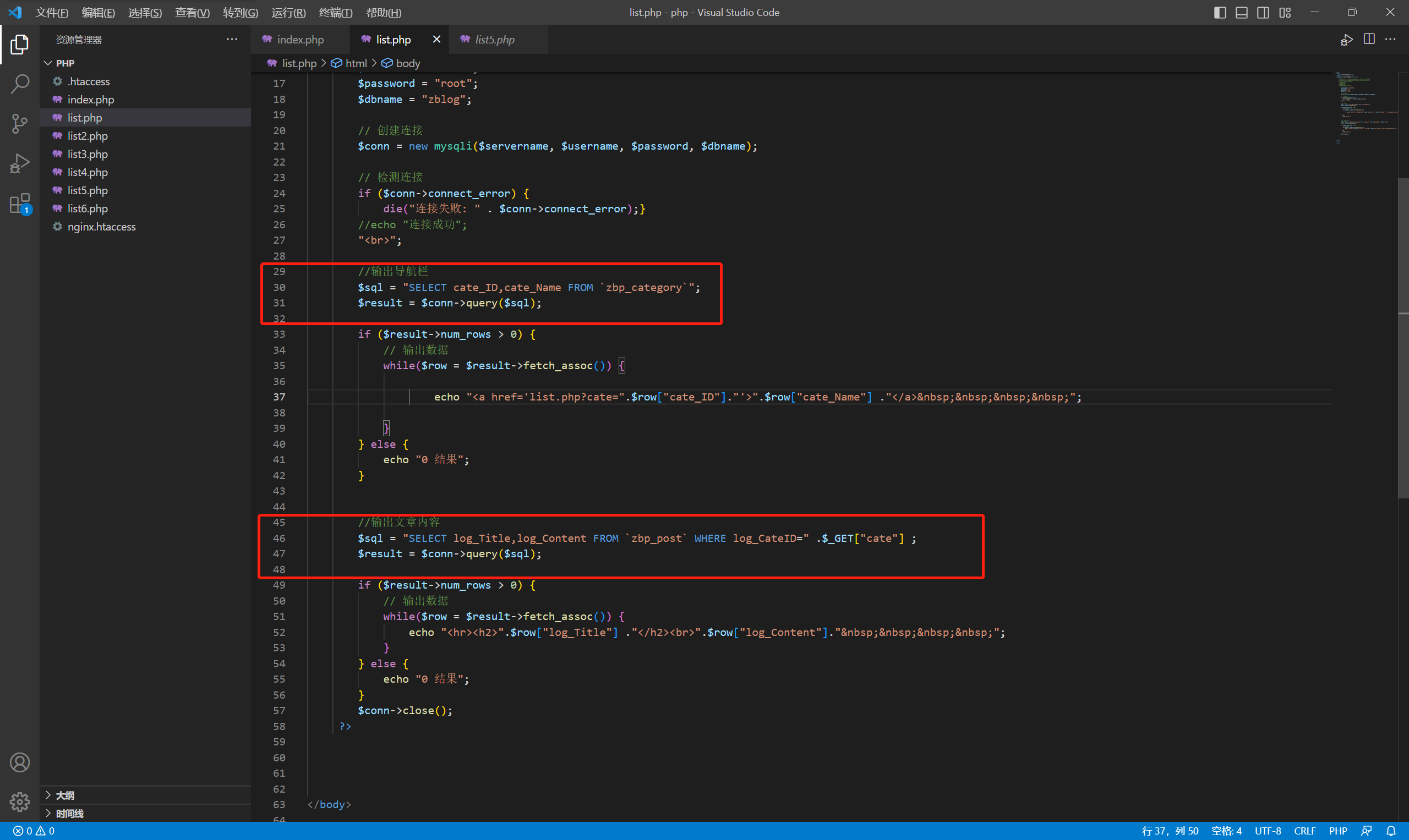 只有list.php中的第46行是有变量的sql语句,注入漏洞要从这里进行。
