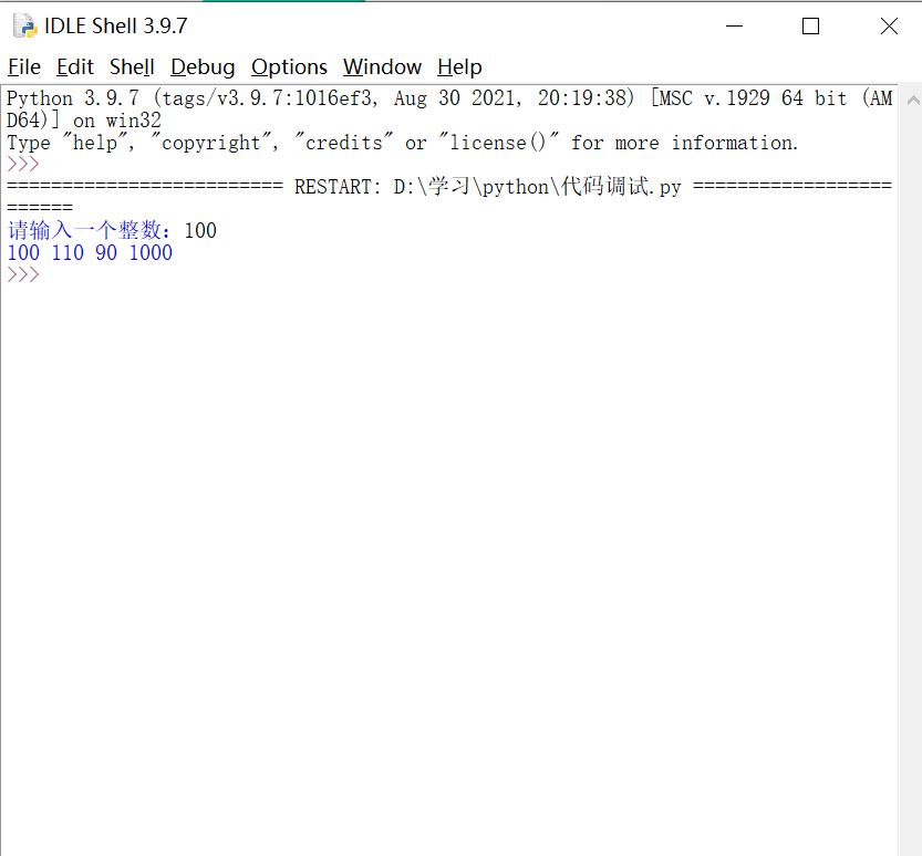 n=eval(input("请输入一个整数:"))N=abs(n)a=N+10b=N-10c=N*10if n>0: a=abs(a) b=abs(b) c=abs(c)else: a=-abs(a) b=-abs(b) c=-abs(c)print(N,a,b,c,end="")
