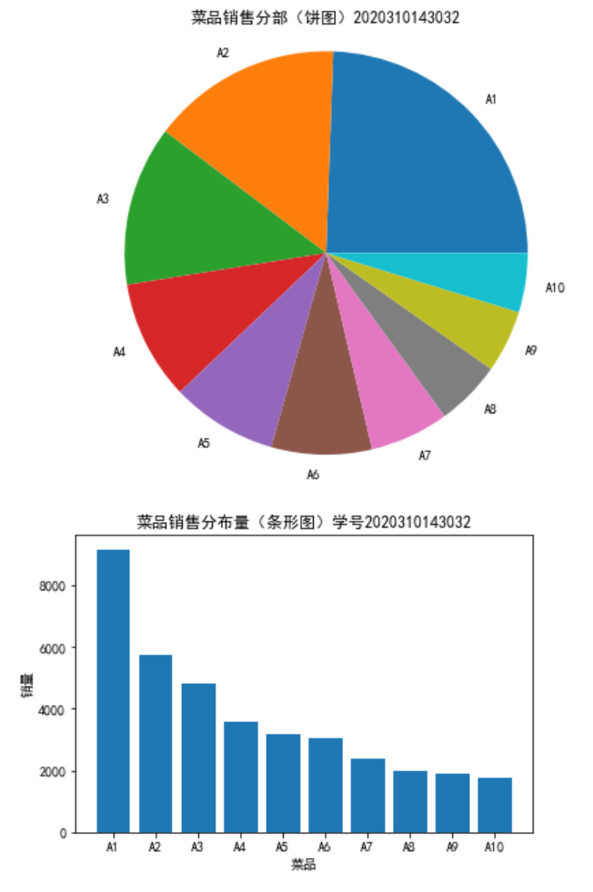 plt.title('菜品销售分布量(条形图)学号2020310143032')