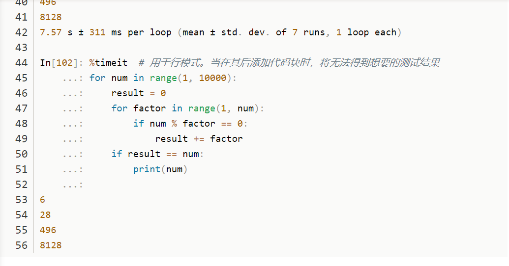 2> 单元模式: 用于代码块的测试。它不仅对紧跟其后的代码发挥作用,通过换行符添加的其余代码,会被视为一个整体进行测试。其中,第一行代码用作设置代码(已执行但未计时),并且单元的主体已计时。单元主体可以访问在设置代码中创建的任何变量。