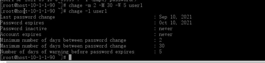 可以使用如下命令查看用户user1当前的口令时效信息:chage -l user1